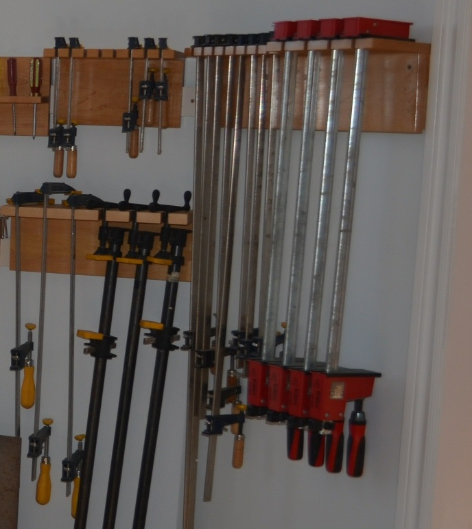 I have clamp racks to fit the different clamps that I have. I cut a slot to hold each clamp. Some clamps have a wider neck, so therefore I have different widths of slots depending on what I want the rack to hold.