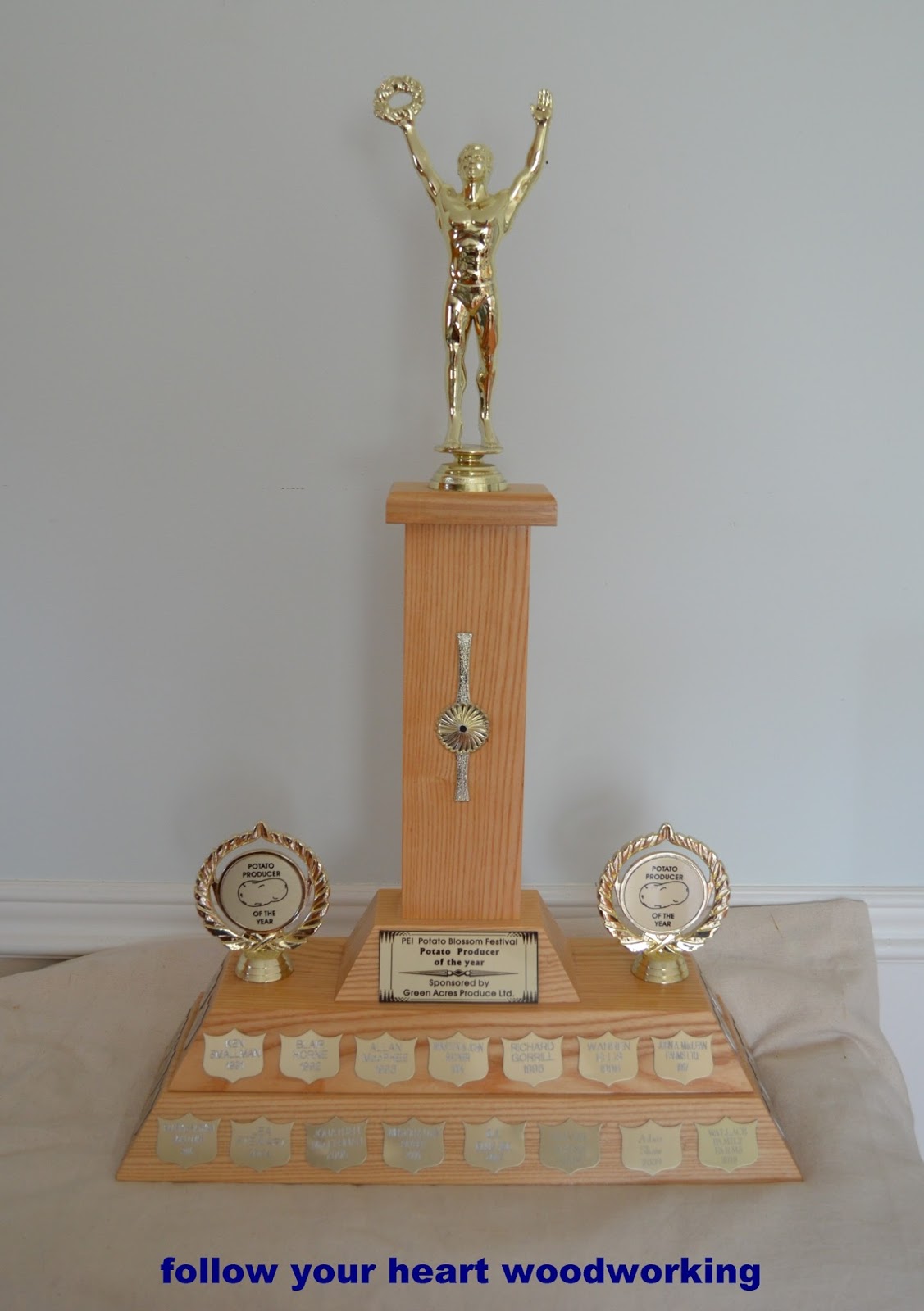 The trophy is made of ash and the committee wanted the new base to match the wood as well as the angled sides of the original trophy.